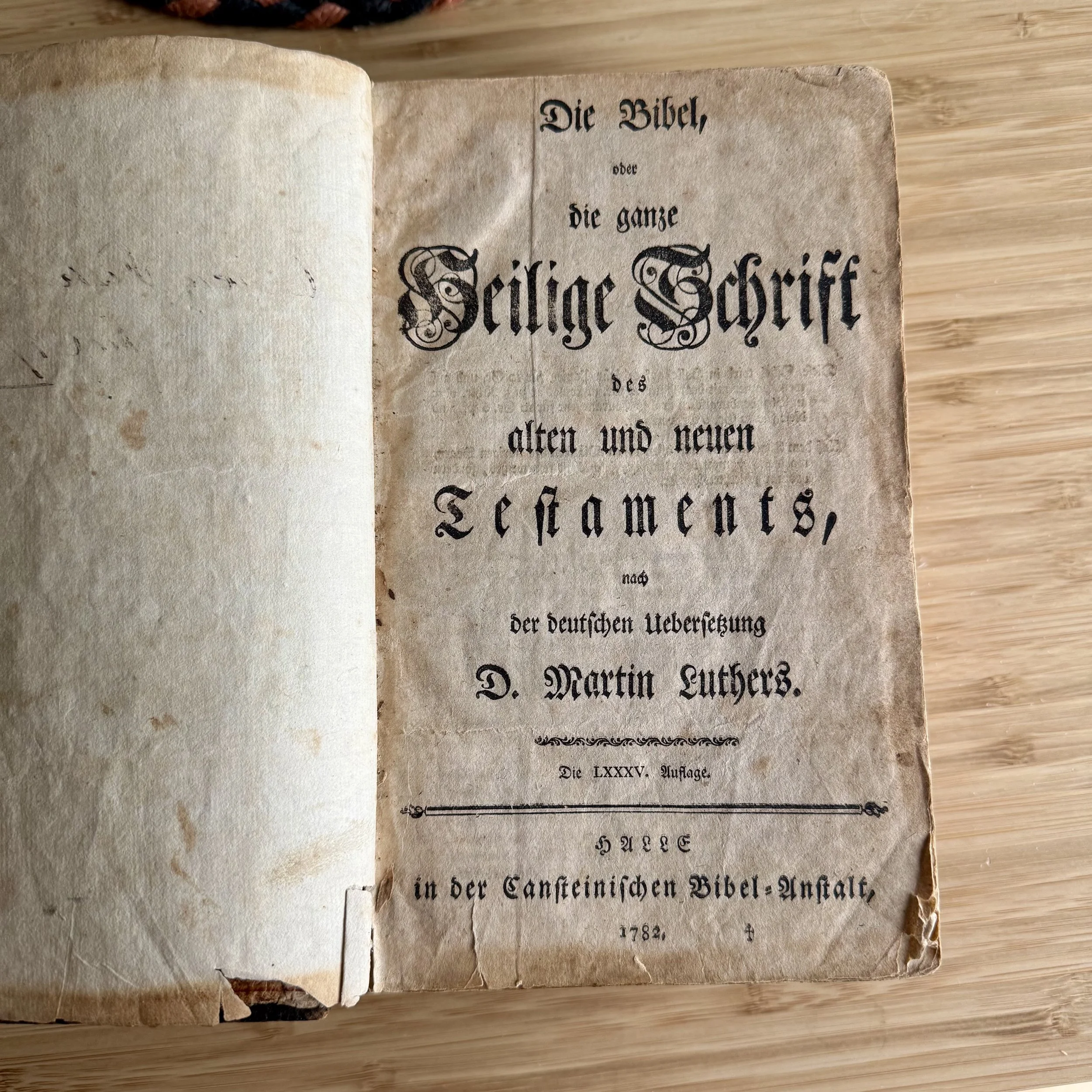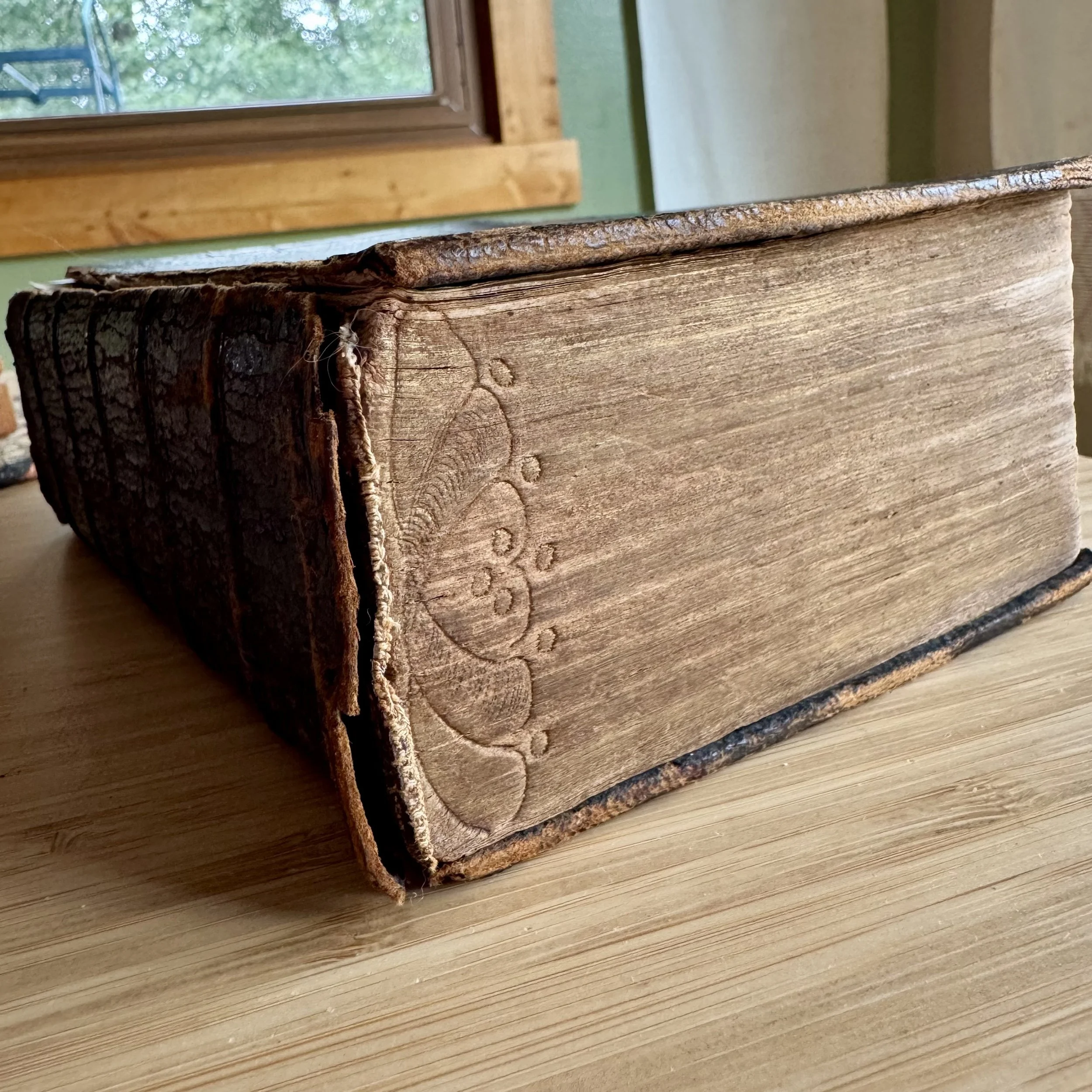 It’s a simple punch-type decoration with a sweet heart. We’re familiar with the common bookplate decorations of the Pennsylvania Dutch, but page edge decoration is more of an English practice. The Swem Library at William & Mary has a large collection of such fore-edge painted books. This book is certainly not English — it’s a 1782 Luther translation of the Bible printed at Halle, Germany.